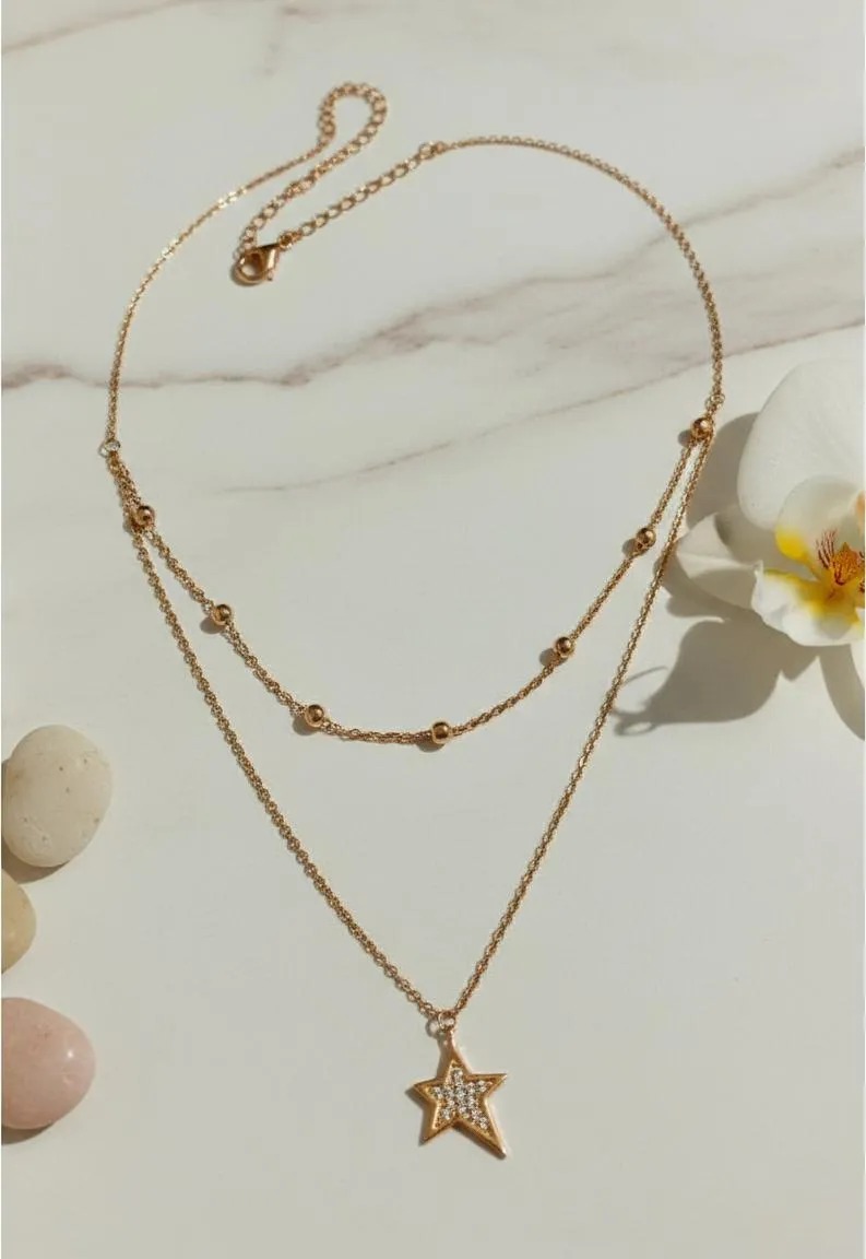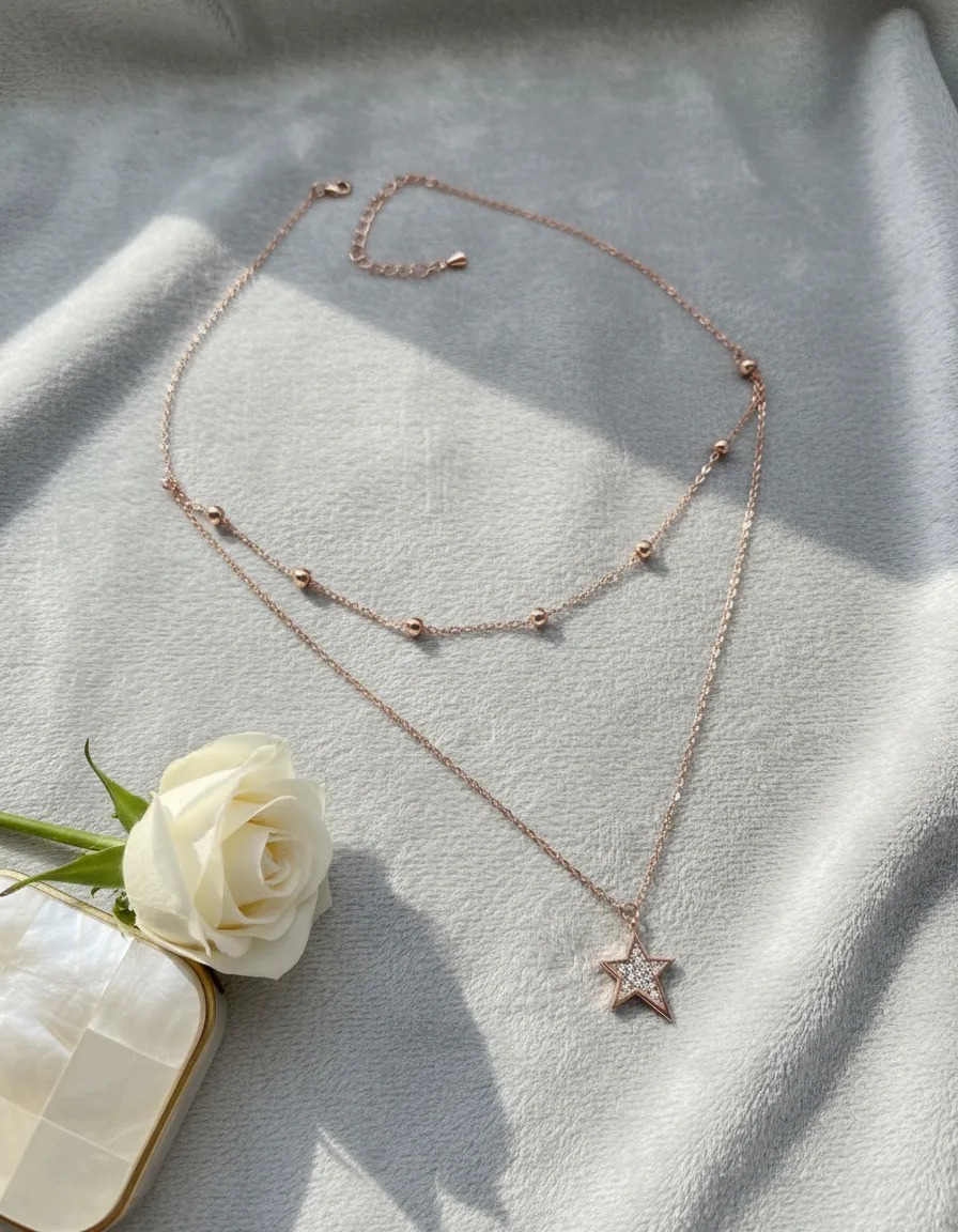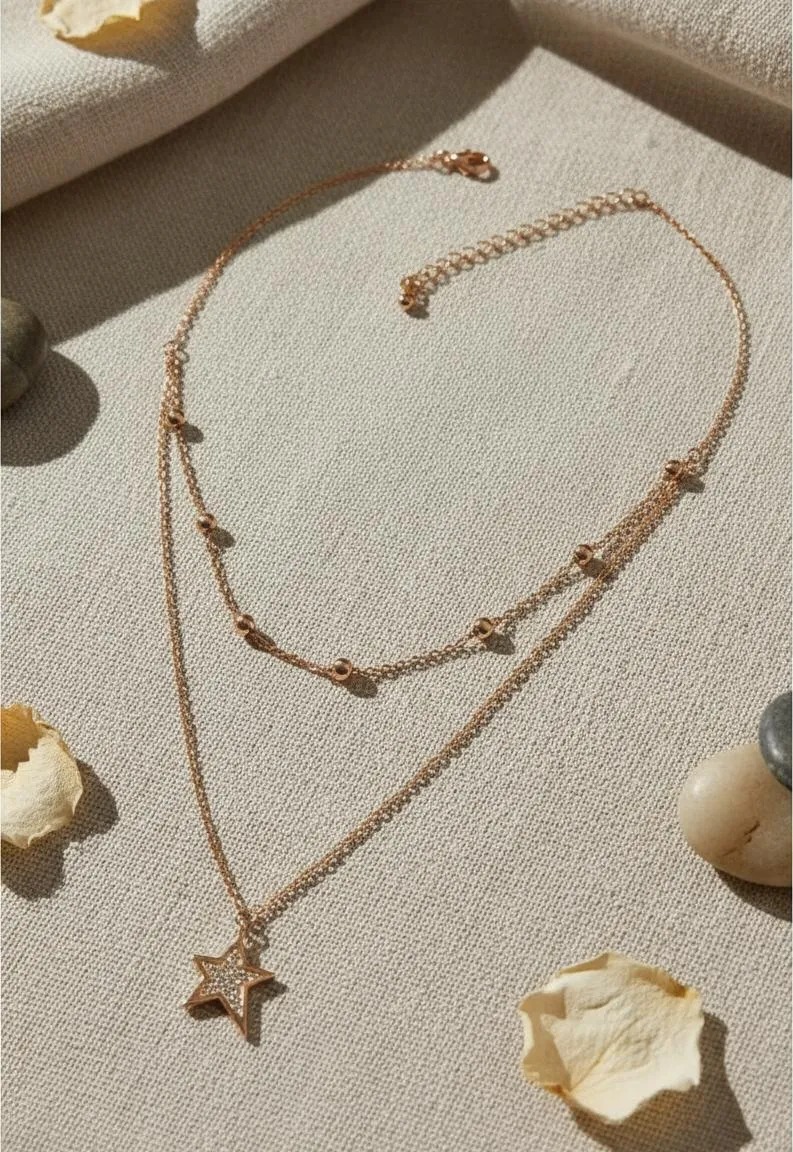 COLAR MY EK CAMADA DUPLA ESTRELA PRATA S925 ROSÊ E PEDRAS EM ZIRCÔNIAS - my EK