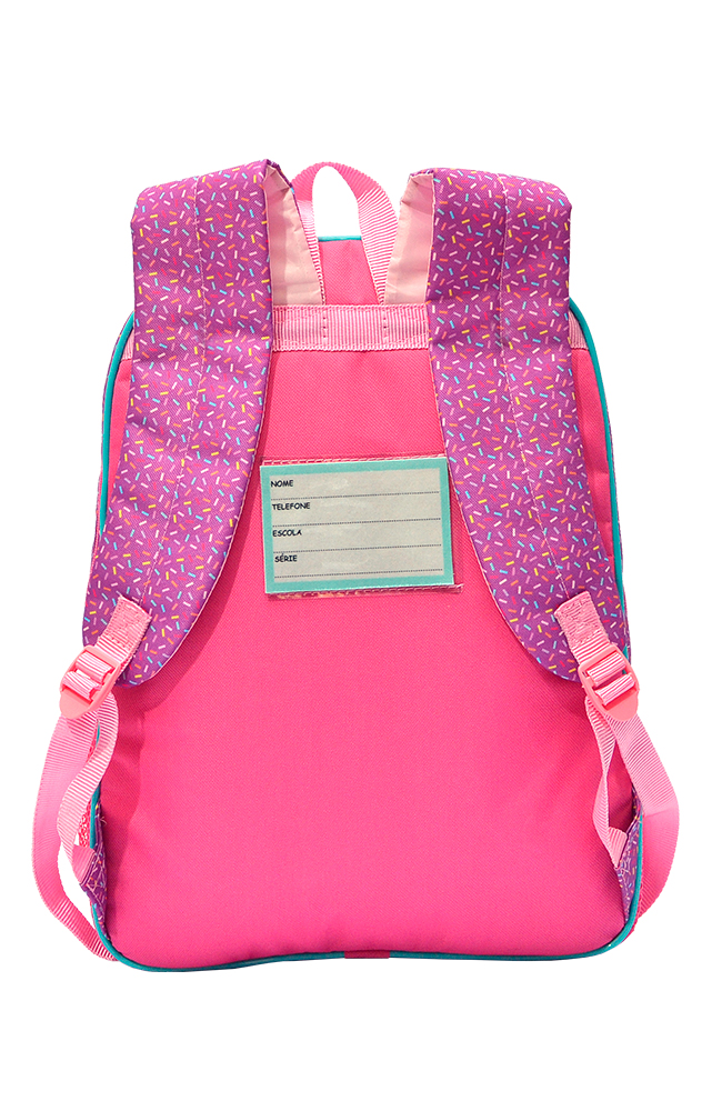 É puro charme! Você vai se apaixonar! Produzida em Poliéster / Cetim , um material muito resistente e com excelente acabamento interno. Possui alça de costas espumadas ,proporcionando maior conforto aos ombros e alça de mão. Além disso, tem bolso lateral com elástico . Tem também identificador no verso, para você colocar o seu nome.