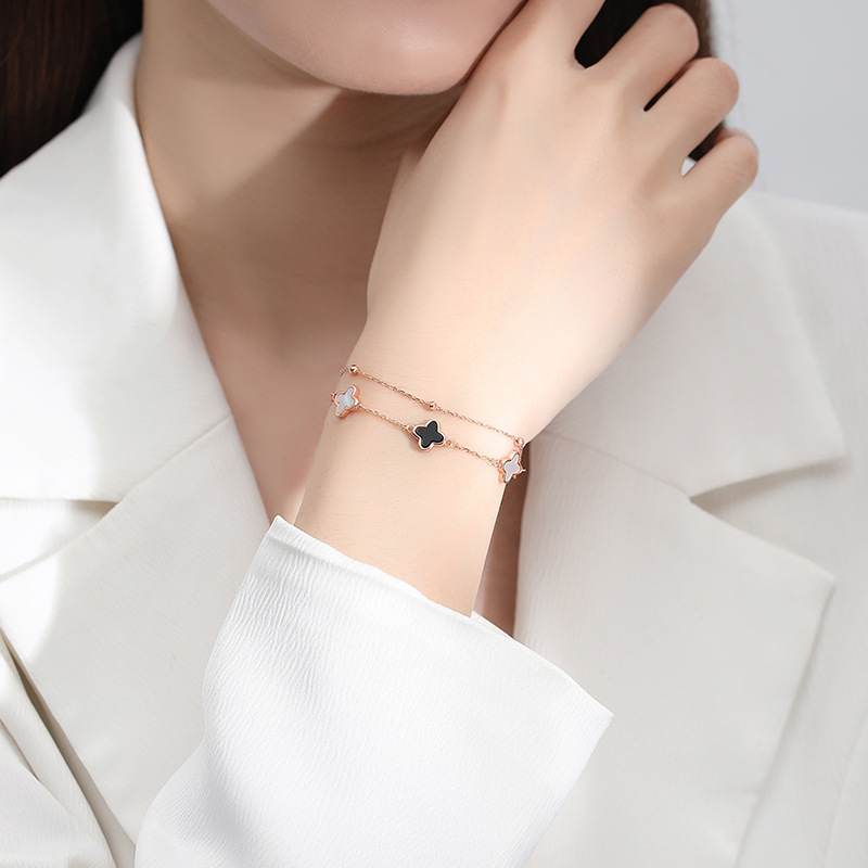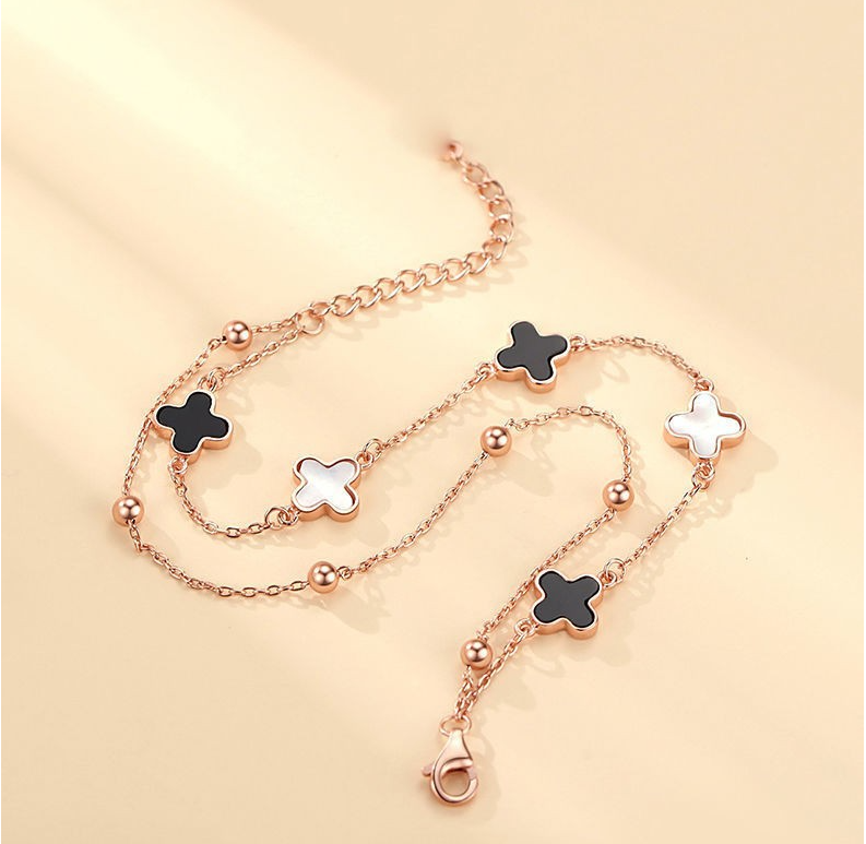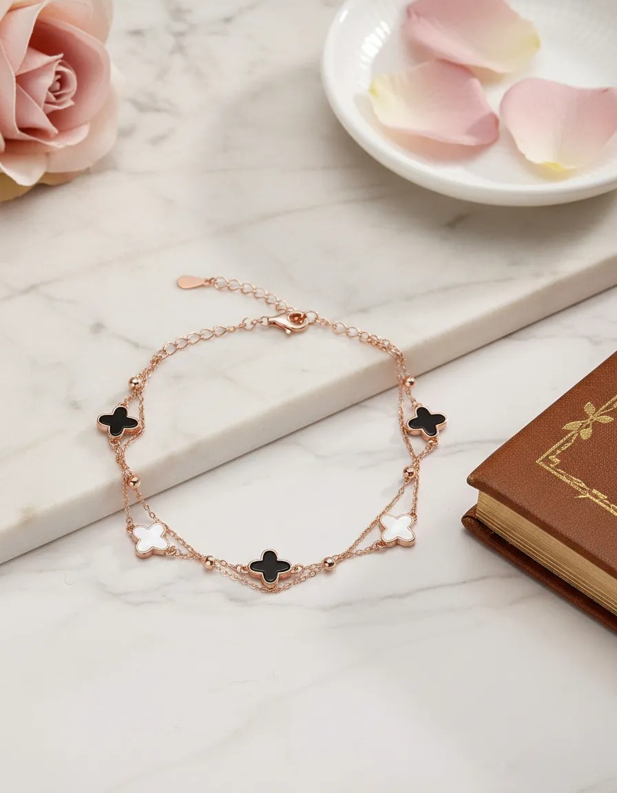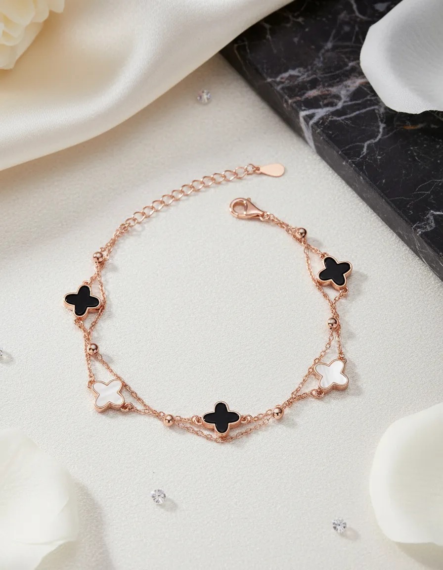 PULSEIRA MY EK CAMADA DUPLA 5 TREVOS PRATA S925 COR ROSÊ E PEDRAS AGATA - my EK