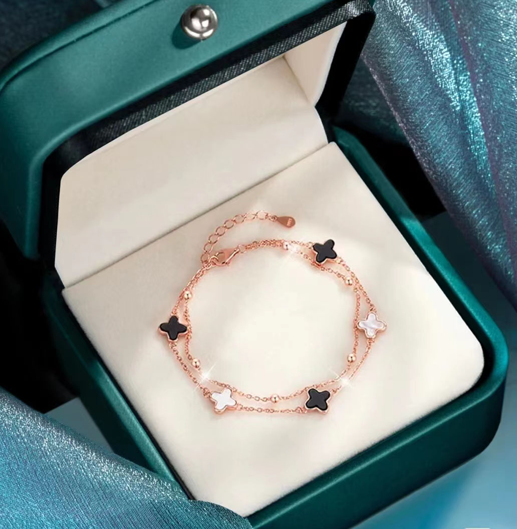 Apresentamos a Pulseira My Ek Camada Dupla 5 Trevos Prata S925 e Pedras Ágata, uma peça que une a elegância e o estilo moderno. Esta pulseira dupla camada, feita com prata 925 legítima, destaca-se por seu design sofisticado e contemporâneo, ideal para adultos que buscam realçar sua estética pessoal.
