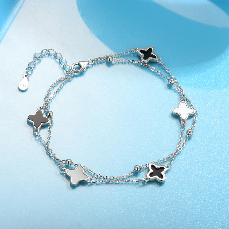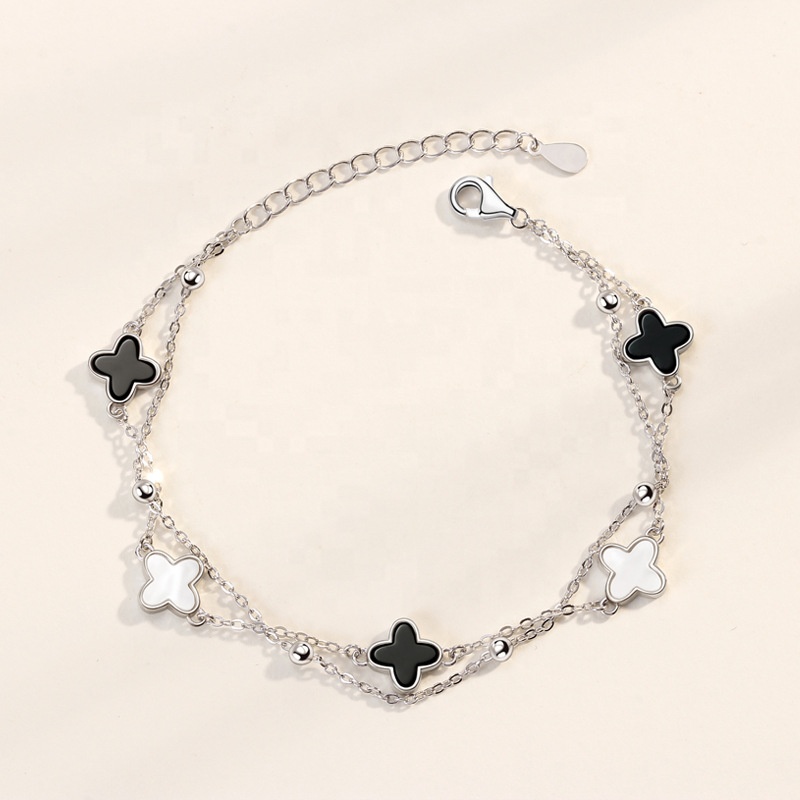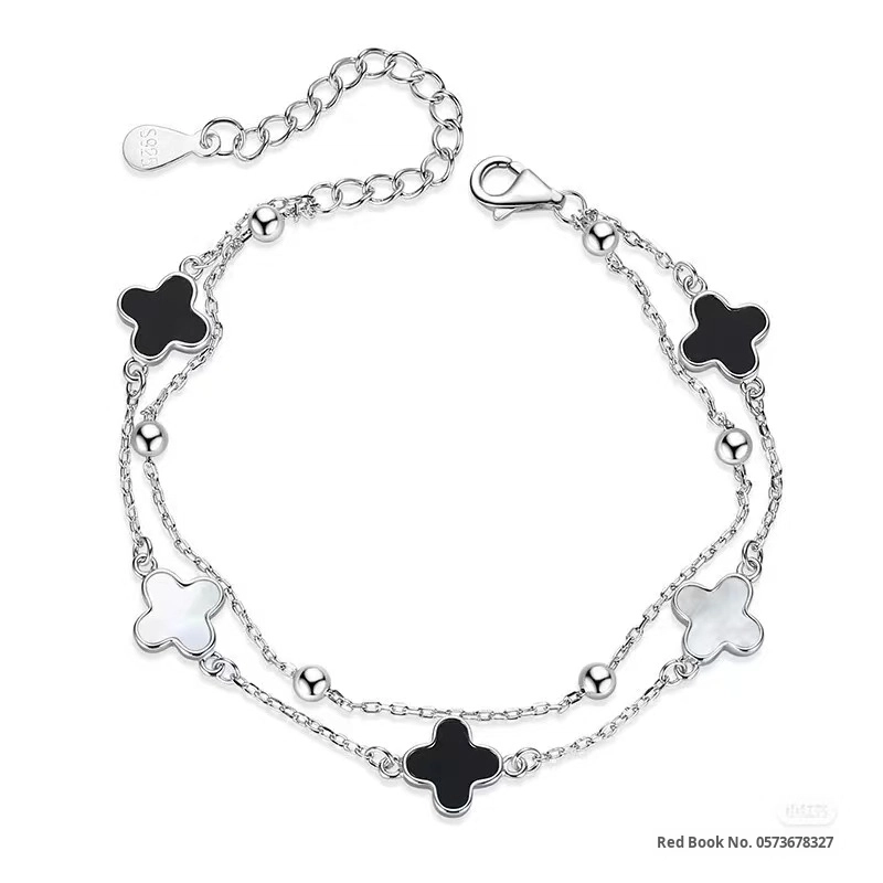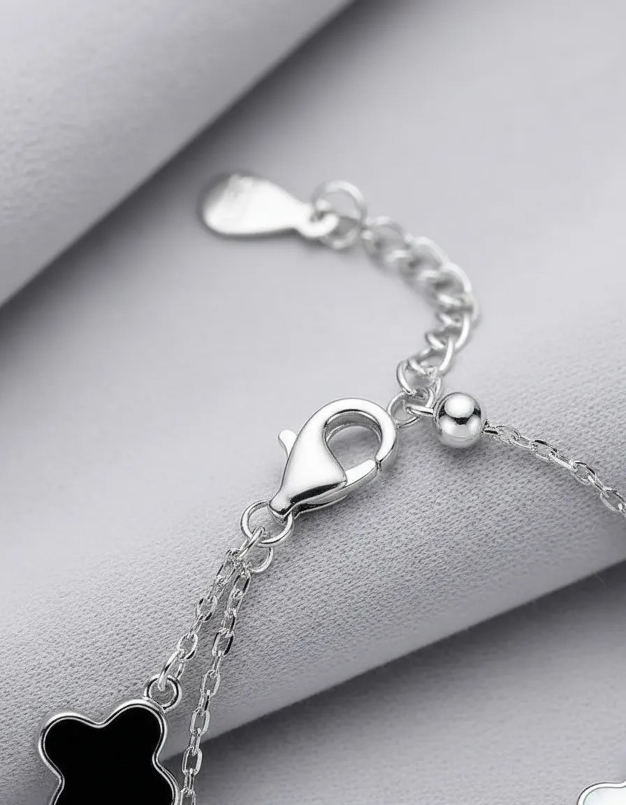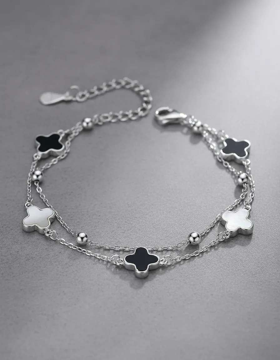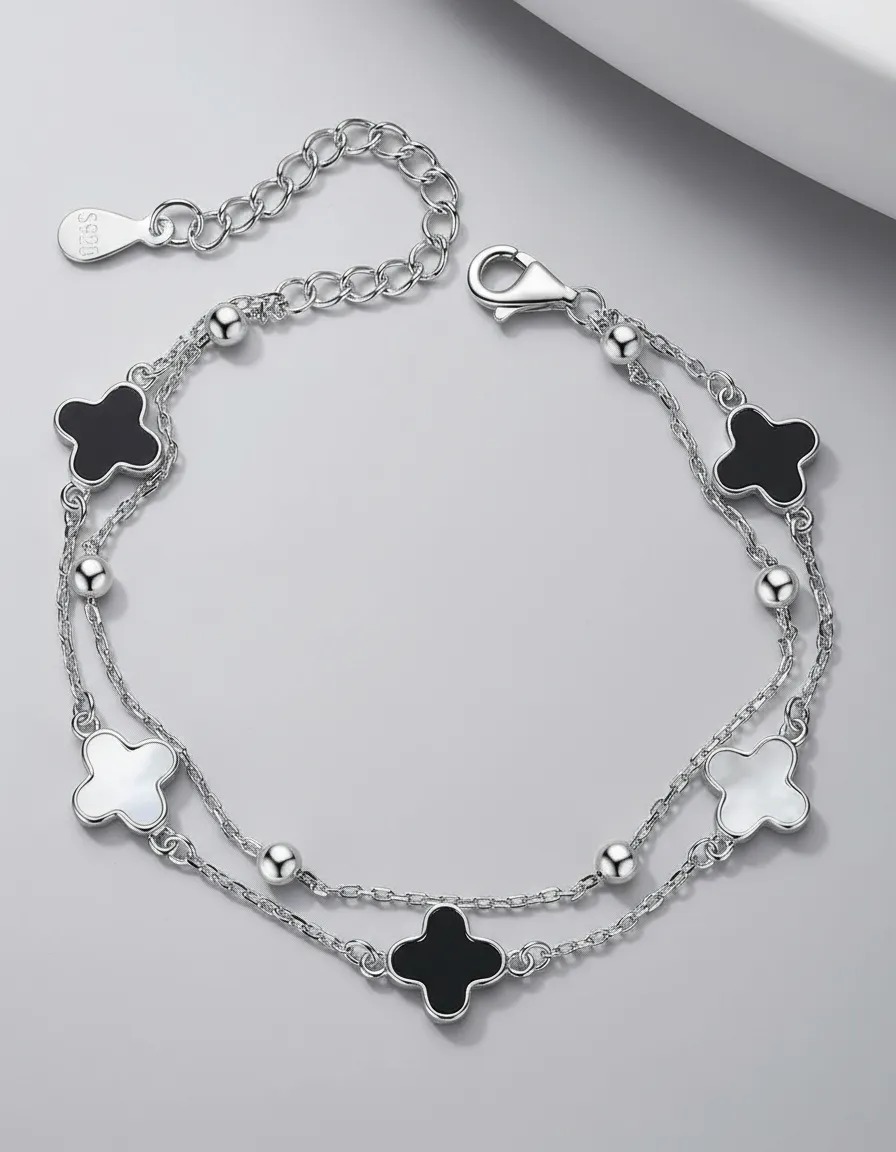 Apresentamos a Pulseira My Ek Camada Dupla 5 Trevos Prata S925 e Pedras Ágata, uma peça que une a elegância e o estilo moderno. Esta pulseira dupla camada, feita com prata 925 legítima, destaca-se por seu design sofisticado e contemporâneo, ideal para adultos que buscam realçar sua estética pessoal.